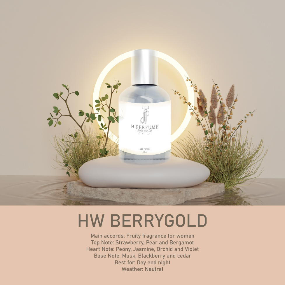 Main accords: Fruity fragrance for women Top Note: Strawberry, Pear and Bergamot Heart Note: Peony, Jasmine, Orchid and Violet Base Note: Musk, Blackberry and cedar Best for: Day and night Weather: Neutral